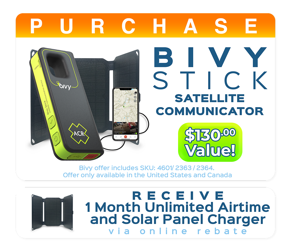 Purchase an ACR Bivy Stick between November 1 through December 24, 2021, and receive 1 Free Month of the Unlimited Service along with a Free Solar Panel Battery Recharger via Online Rebate Form. $130 Retail Value.