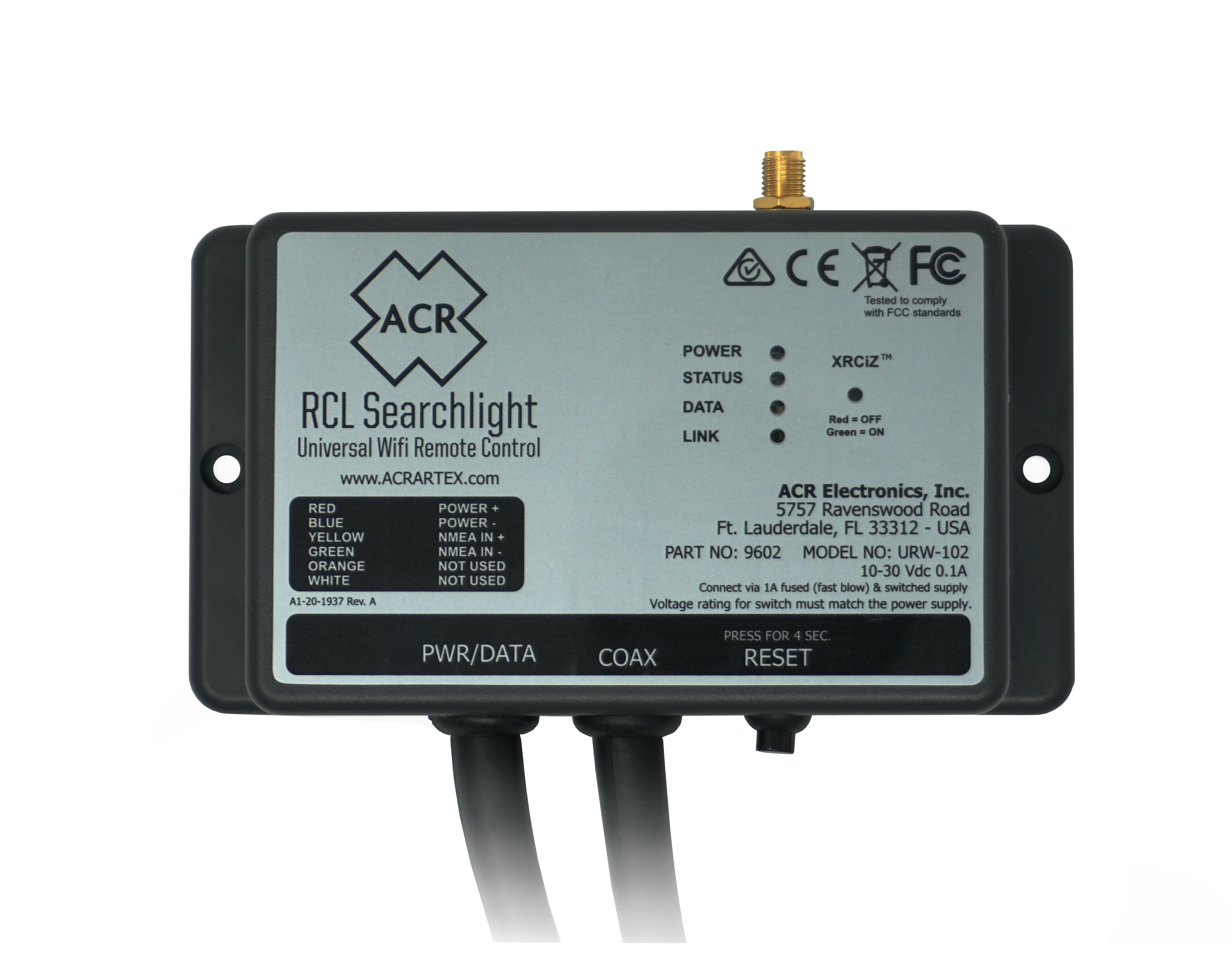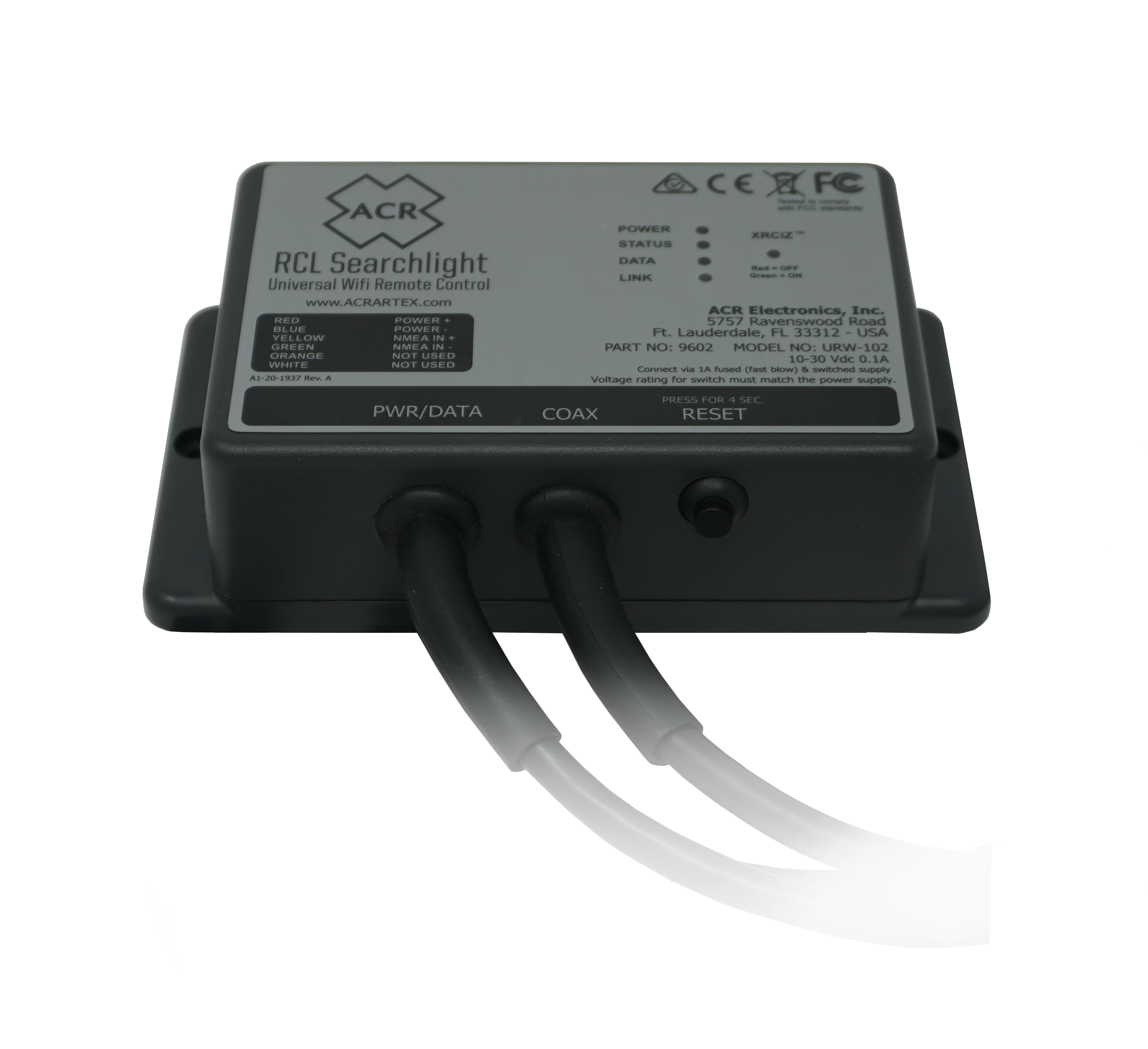 The Wi-Fi module has an integral Power/Data cable with four wires. The function of each wire is shown on the product label. The Wi-Fi Module has an NMEA0183 input that allows an external GPS to provide position information for display in the ACR Searchlight App. This is particularly useful if the mobile device does not have an internal GPS, such as a Wi-Fi only iPad. If no external GPS is connected, the App will automatically use the mobile device’s internal GPS and if this is not available, no position will be displayed in the ACR Searchlight App.